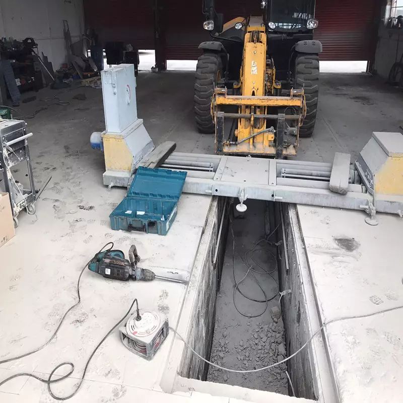 Professional brake measuring machine installation with reinforced concrete slab. Full setup including concrete cutting, steel reinforcement, and secure 20 cm